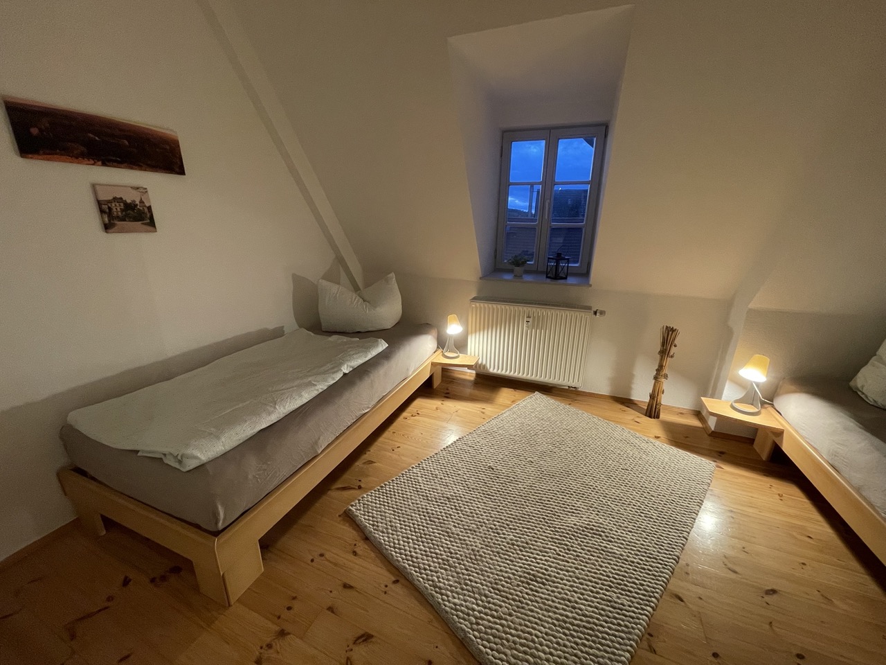 Schlafzimmer mit zwei Einzelbetten und Domblick